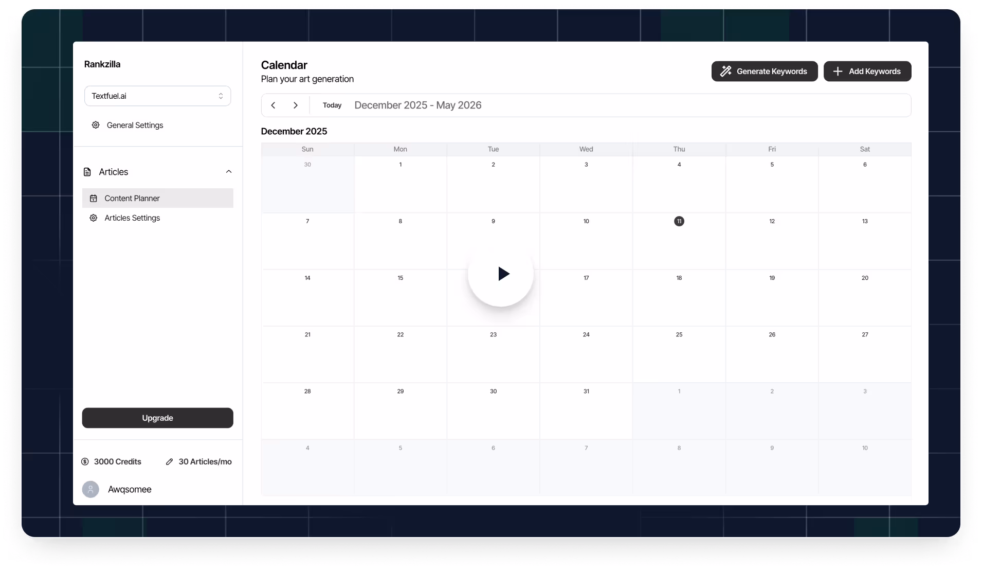 Rankzilla can create one optimized article per day, up to 30 articles per month. Each piece is quality-checked before it’s ready to go live. During the trial period, articles may include a Rankzilla watermark; paid plans deliver clean, unbranded content.